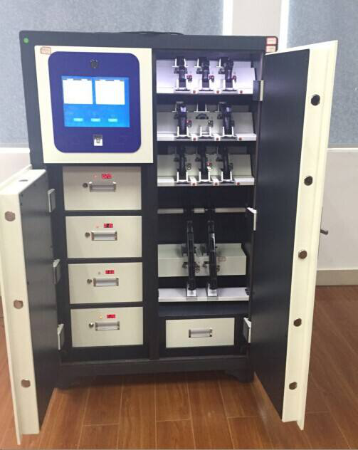 2.LCD实时时间显示,操作状态显示3.中央控制宇锁控制部分分离,采用总线方式扩展,扩展灵活、方便。4.每组柜子的数量、容量可选,一个主控柜可带多个辅助柜。5.具有红外线探测系统,能够对错误的存取进行自动纠正。6.强大的管理查询功能,可以查询每一次指纹、人脸操作的时间、指纹号码、人脸信息及进行了何种操作。7.无需携带钥匙或密码,凭手指或人脸就可以轻松存取物品。8.操作简单,存取全程有语言向导指导操作的进行。9.取/还武器配件必须通过验证士兵和管理员的按指纹、人脸确认身份。10.指纹识别器,识别率高,快速准确;对于被水浸过、脏的指纹(只要手指不受损),仍能达到100%的识别率。采用生物指纹模作为取物凭证,提高了凭证的保密性。11.友好,明了的用户界面采用点阵式带背光的大屏幕液晶显示屏,为用户和管理者的使用和管理作提示。12.语音提示提醒用户登记柜号与关门信息。13.灵活的参数化设置用户可根据需要,通过管理员密码设置和修改,日志查询、时间设置。14.上级领导可在授权情况下通过遥控指令或监控后台查询武器配件的使用情况和禁止某人用武器配件。15.支持经过专用网络短信提醒,短信授权16.在停电情况下,可通过授权用钥匙一次性打开所有枪锁和电子抽屉;17.柜门被撬,柜门失窃及非法操作(包括断电、用钥匙以机械方式开柜门或枪锁)时,系统自动发出报警,并可通过短信方式,向管理员或监管领导发送报警信息。18.储物柜外型均采用优质碳化钢精制,柜体设计合理、美观、安全。根据不同单位的武器配件数量和类型选用最合理的柜号型号来设计装配方案。19.停电的情况下可以通过授权用钥匙紧急打开所有柜门。20.采用开关电源和不间断电源在停电或电网电压波动大的情况下,机器可自动接上备用电源或对电源进行调节。停电后,使用备用电源可正常工作不少于6小时。